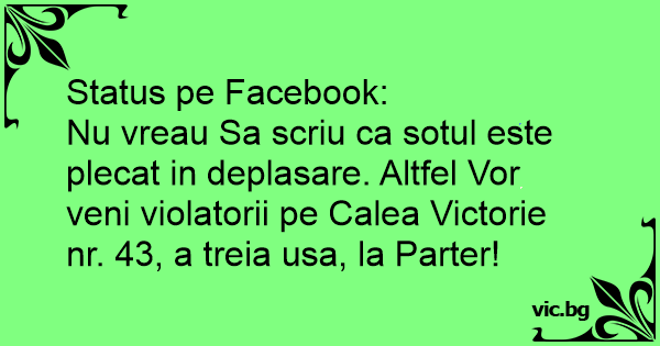 Nu vreau Sa scriu ca sotul este plecat in deplasare. Altfel Vor veni violatorii pe Calea Victorie nr. 43, a treia usa, la Parter!
