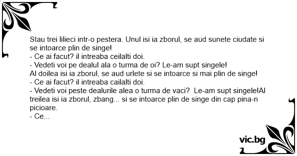 Trei Lilieci pe-o creanga. Primul zboara,dupa o ora vine inapoi,plin cu singe si intreaba:Vedeti turma cu vaci?Praf i-am facut. Al doilea zboara si dupa 30 min. vine inapoi plin cu singe. Vedeti...