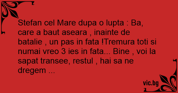 Stefan cel Mare dupa o lupta : Ba, care a baut aseara , inainte de batalie , un pas in fata !Tremura toti si numai vreo 3 ies in fata... Bine , voi la sapat transee, restul , hai sa ne dregem ...