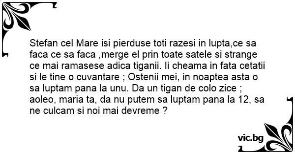 Stefan cel Mare isi pierduse toti razesi in lupta,ce sa faca ce sa faca ,merge el prin toate satele si strange ce mai ramasese adica tiganii. Ii cheama in fata cetatii si le tine o cuvantare ; Ostenii mei, in noaptea asta o sa luptam pana la unu. Da un tigan de colo zice ; aoleo, maria ta, da nu putem sa luptam pana la 12, sa ne culcam si noi mai devreme ?