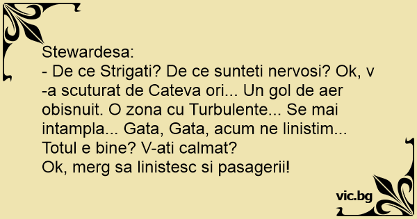- De ce Strigati? De ce sunteti nervosi? Ok, v-a scuturat de Cateva ori... Un gol de aer obisnuit. O zona cu Turbulente... Se mai intampla... Gata, Gata, acum ne linistim... Totul e bine? V-ati calmat?