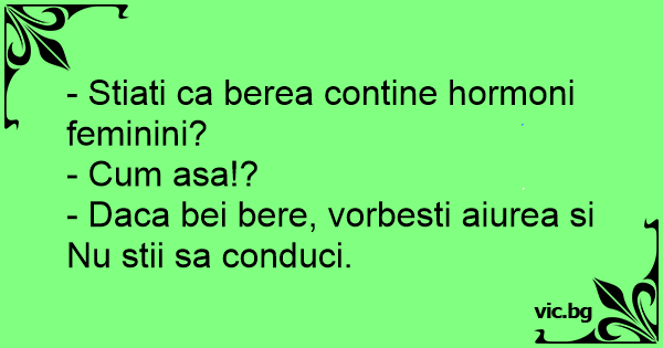 ¿ Sabías que la cerveza tiene hormonas femeninas ?,le dice un borracho en un bar a otro. - No te creo. - Si, fijate si tomas demasiado, empiezas a hablar mucho y manejas el auto de lo peor.