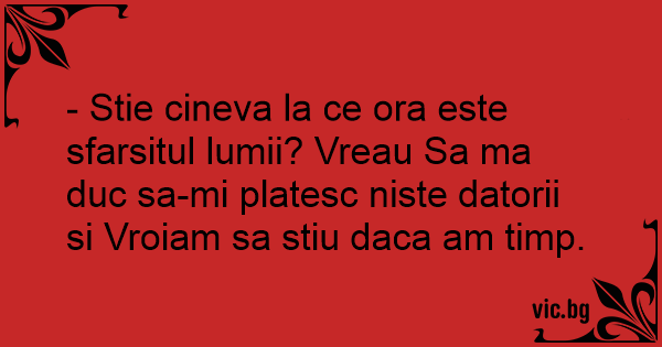 - Stie cineva la ce ora este sfarsitul lumii? Vreau Sa ma duc sa-mi platesc niste datorii si Vroiam sa stiu daca am timp.