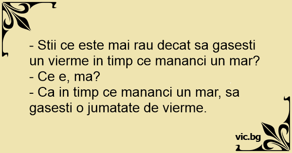 - Stii ce este mai rau decat sa gasesti un vierme in timp ce mananci un mar?