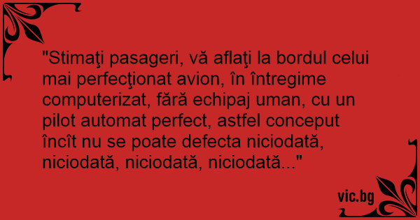"Stimaţi pasageri, vă aflaţi la bordul celui mai perfecţionat avion, în întregime computerizat, fără echipaj uman, cu un pilot automat perfect, astfel conceput încît nu se poate defecta niciodată, niciodată, niciodată, niciodată..."