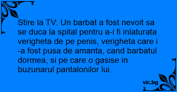 Stire la TV: Un barbat a fost nevoit sa se duca la spital pentru a-i fi inlaturata verigheta de pe реnis, verigheta care i-a fost pusa de amanta, cand barbatul dormea, si pe care o gasise in buzunarul pantalonilor lui.