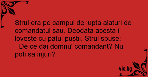 Strul era pe campul de lupta alaturi de comandatul sau. Deodata acesta il loveste cu patul pustii. Strul spuse: