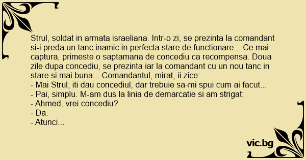 Strul, soldat in armata israeliana. Intr-o zi, se prezinta la comandant si-i preda un tanc inamic in perfecta stare de functionare... Ce mai captura, primeste o saptamana de concediu ca recompensa. Doua zile dupa concediu, se prezinta iar la comandant cu un nou tanc in stare si mai buna... Comandantul, mirat, ii zice: