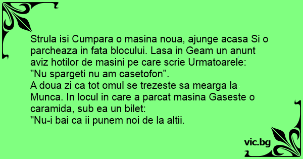 Strula isi Cumpara o masina noua, ajunge acasa Si o parcheaza in fata blocului. Lasa in Geam un anunt aviz hotilor de masini pe care scrie Urmatoarele: