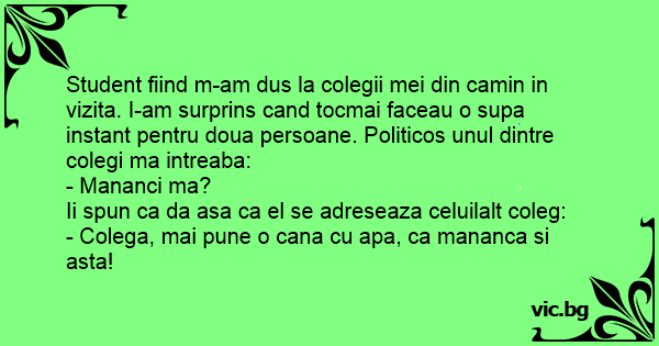 Student fiind m-am dus la colegii mei din camin in vizita. I-am surprins cand tocmai faceau o supa instant pentru doua persoane. Politicos unul dintre colegi ma intreaba: