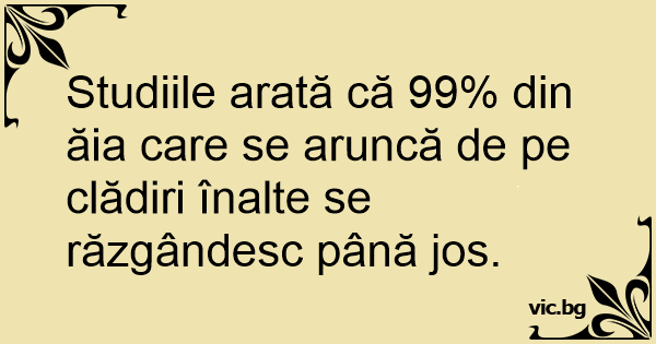 Studiile arată că 99% din ăia care se aruncă de pe clădiri înalte se răzgândesc până jos.