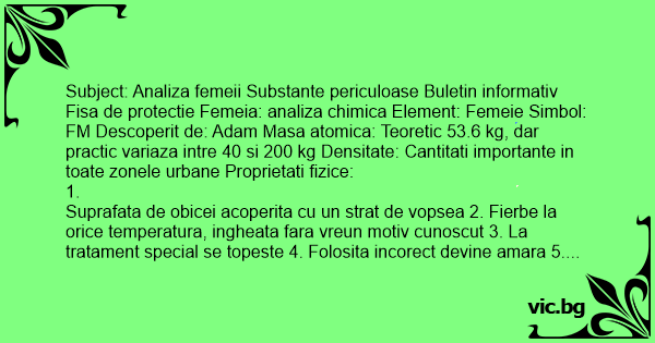 Subject: Analiza femeii Substante periculoase Buletin informativ Fisa de protectie Femeia: analiza chimica Element: Femeie Simbol: FM Descoperit de: Adam Masa atomica: Teoretic 53.6 kg, dar practic variaza intre 40 si 200 kg Densitate: Cantitati importante in toate zonele urbane Proprietati fizice: