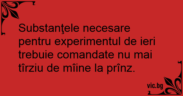 Substanţele necesare pentru experimentul de ieri trebuie comandate nu mai tîrziu de mîine la prînz.