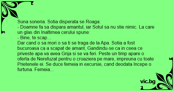 - Doamne fa sa dispara amantul, iar Sotul sa nu stie nimic. La care un glas din Inaltimea cerului spune: