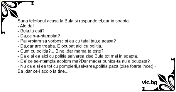 Suna telefonul acasa la Bula si raspunde el,dar in soapta:
