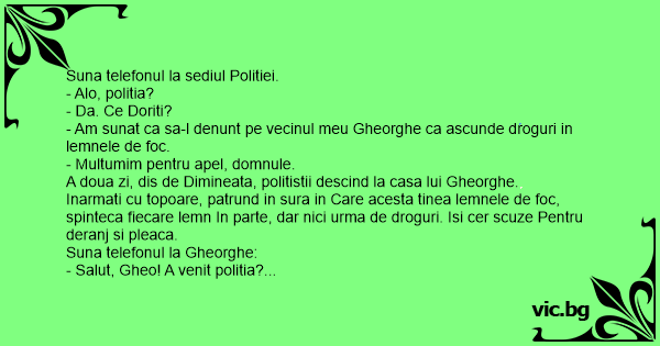 - Am sunat ca sa-l denunt pe vecinul meu Gheorghe ca ascunde droguri in lemnele de foc.