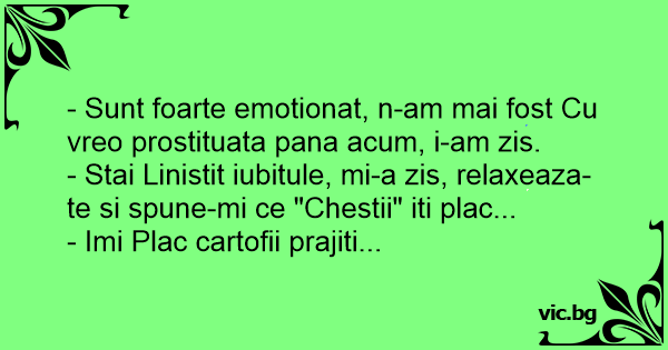 - Sunt foarte emotionat, n-am mai fost Cu vreo prostituata pana acum, i-am zis.
