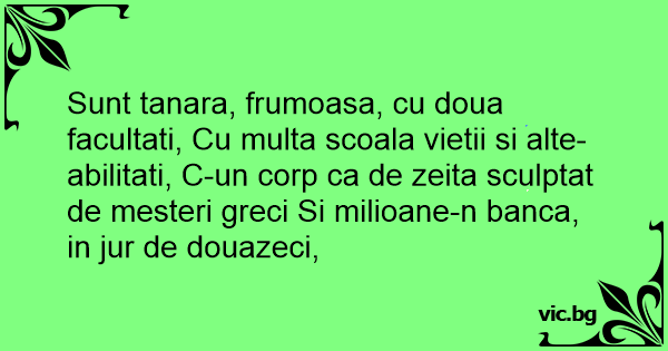 Sunt tanara, frumoasa, cu doua facultati, Cu multa scoala vietii si alte-abilitati, C-un corp ca de zeita sculptat de mesteri greci Si milioane-n banca, in jur de douazeci,