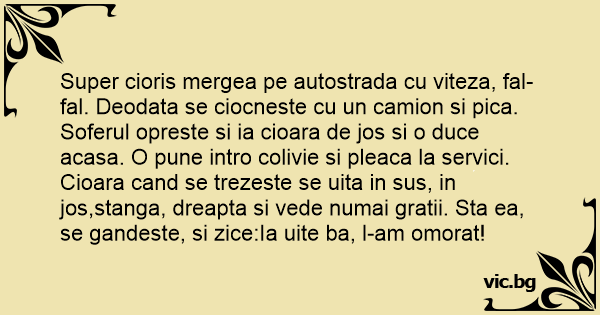 Super cioris mergea pe autostrada cu viteza, fal-fal. Deodata se ciocneste cu un camion si рiса. Soferul opreste si ia cioara de jos si o duce acasa. O pune intro colivie si pleaca la servici. Cioara cand se trezeste se uita in sus, in jos,stanga, dreapta si vede numai gratii. Sta ea, se gandeste, si zice:Ia uite ba, l-am omorat!