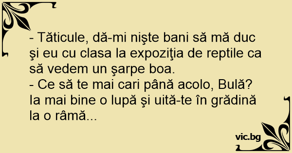 - Tăticule, dă-mi nişte bani să mă duc şi eu cu clasa la expoziţia de reptile ca să vedem un şarpe boa.