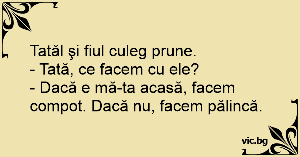 - Dacă e mă-ta acasă, facem compot. Dacă nu, facem pălincă.