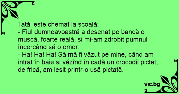 - Fiul dumneavoastră a desenat pe bancă o muscă, foarte reală, si mi-am zdrobit pumnul încercând să o omor.