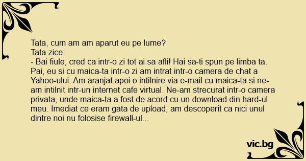 - Bai fiule, cred ca intr-o zi tot ai sa afli! Hai sa-ti spun pe limba ta. Pai, eu si cu maica-ta intr-o zi am intrat intr-o camera de chat a Yahoo-ului. Am aranjat apoi o intilnire via e-mail cu maica-ta si ne-am intilnit intr-un internet cafe virtual. Ne-am strecurat intr-o camera privata, unde maica-ta a fost de acord cu un download din hard-ul meu. Imediat ce eram gata de upload, am descoperit ca nici unul dintre noi nu folosise firewall-ul si fiindca deja era prea tirziu sa dam delete, noua luni mai tirziu a aparut un mic popup care a tipat din toti rarunchii: