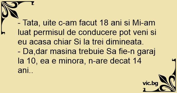 - Tata, uite c-am facut 18 ani si Mi-am luat permisul de conducere рот veni si eu acasa chiar Si la trei dimineata.