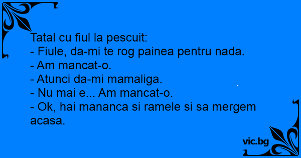 Отишли баща и син за риба, да ама не кълве и не кълве...Бащата се обърнал към сина: - Синко я дай от чантата сандвичите дето майкати ги сложи за закуска да закусим и тъй и тъй не кълве! Синът...