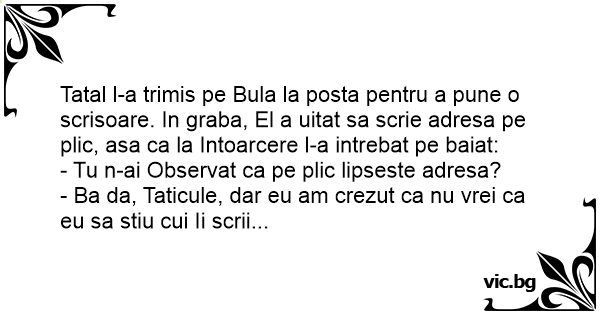 Tatal l-a trimis pe Bula la posta pentru a pune o scrisoare. In graba, El a uitat sa scrie adresa pe plic, asa ca la Intoarcere l-a intrebat pe baiat: