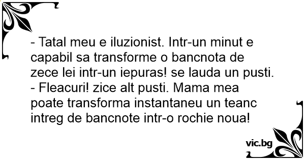 - Tatal meu e iluzionist. Intr-un minut e capabil sa transforme o bancnota de zece lei intr-un iepuras! se lauda un pusti.