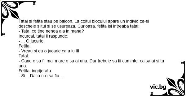 Tatal si fetita stau pe balcon. La coltul blocului apare un individ ce-si descheie slitul si se usureaza. Curioasa, fetita isi intreaba tatal: