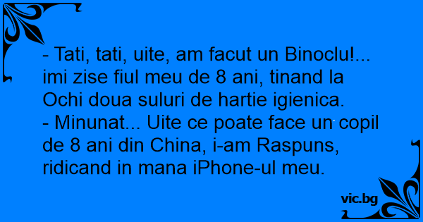 - Tati, tati, uite, am facut un Binoclu!... imi zise fiul meu de 8 ani, tinand la Ochi doua suluri de hartie igienica.