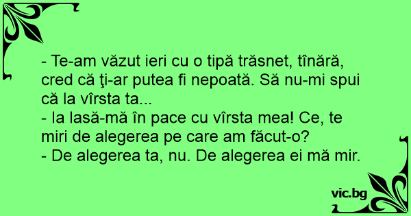 - Te-am văzut ieri cu o tipă trăsnet, tînără, cred că ţi-ar putea fi nepoată. Să nu-mi spui că la vîrsta ta...
