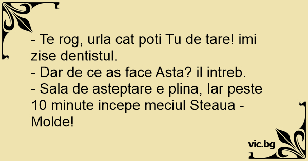 Un dentist, dupa ce isi termina lucrarea, ii spune pacientului: - Imi faci un serviciu?Poti sa tipi foarte tare de cateva ori? - Pai de ce, ca de data asta nu a fost chiar asa de rau?! - Pai da,...