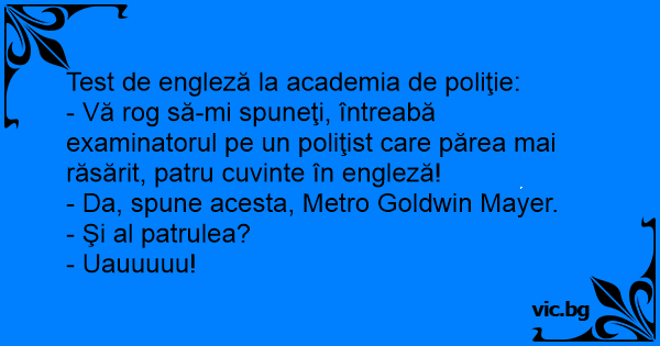 - Vă rog să-mi spuneţi, întreabă examinatorul pe un poliţist care părea mai răsărit, patru cuvinte în engleză!