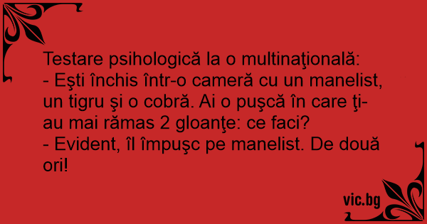 - Eşti închis într-o cameră cu un manelist, un tigru şi o cobră. Ai o puşcă în care ţi-au mai rămas 2 gloanţe: ce faci?