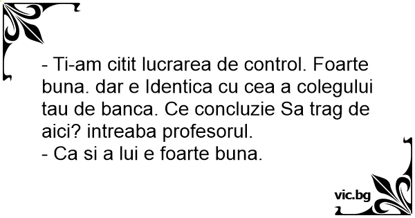 - Ti-am citit lucrarea de control. Foarte buna. dar e Identica cu cea a colegului tau de banca. Ce concluzie Sa trag de aici? intreaba profesorul.