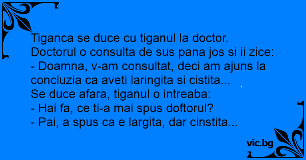 Tiganca se duce cu tiganul la doctor. Doctorul o consulta de sus pana jos si ii zice: