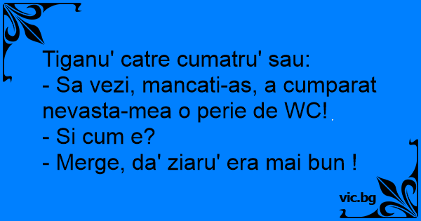 Se introduce canalizarea într-un cartier de ţigani. Ilie îi povestea cumătrului său: - Piranda mea a luat şi perie la WC! - Şi cum e? - Merge, da' ziarul era mai bun