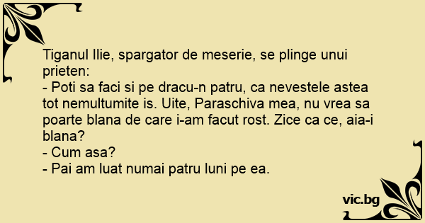 - Poti sa faci si pe dracu-n patru, ca nevestele astea tot nemultumite is. Uite, Paraschiva mea, nu vrea sa poarte blana de care i-am facut rost. Zice ca ce, aia-i blana?