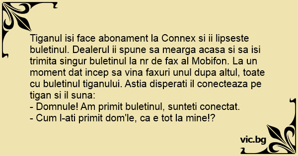 Tiganul isi face abonament la Connex si ii lipseste buletinul. Dealerul ii spune sa mearga acasa si sa isi trimita singur buletinul la nr de fax al Mobifon. La un moment dat incep sa vina faxuri unul dupa altul, toate cu buletinul tiganului. Astia disperati il conecteaza pe tigan si il suna: