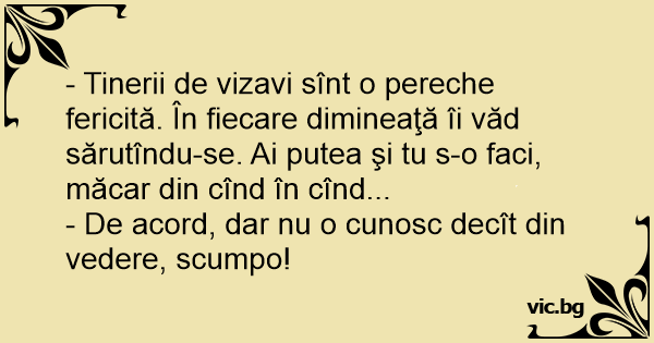 - Tinerii de vizavi sînt o pereche fericită. În fiecare dimineaţă îi văd sărutîndu-se. Ai putea şi tu s-o faci, măcar din cînd în cînd...