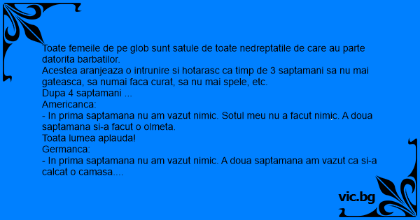 Acestea aranjeaza o intrunire si hotarasc ca timp de 3 saptamani sa nu mai gateasca, sa numai faca curat, sa nu mai spele, etc.