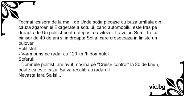 - Domnule politist, am avut masina pe "Cruise control" la 80 de km/h, poate ca este cazul Sa va recalibrati radarul!