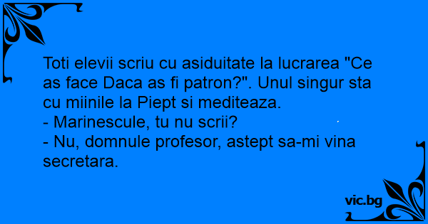 Toti elevii scriu cu asiduitate la lucrarea "Ce as face Daca as fi patron?". Unul singur sta cu miinile la Piept si mediteaza.