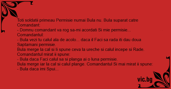 Toti soldatii primeau Permisie numai Bula nu. Bula suparat catre Comandant: