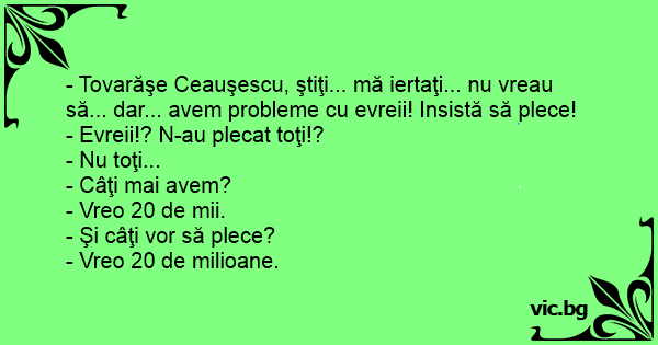 - Tovarăşe Ceauşescu, ştiţi... mă iertaţi... nu vreau să... dar... avem probleme cu evreii! Insistă să plece!