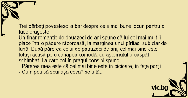 Un tînăr romantic de douăzeci de ani spune că lui cel mai mult îi place într-o pădure răcoroasă, la marginea unui pîrîiaş, sub clar de lună. După părerea celui de patruzeci de ani, cel mai bine este totuşi acasă pe o canapea comodă, cu aşternutul proaspăt schimbat. La care cel în pragul pensiei spune:
