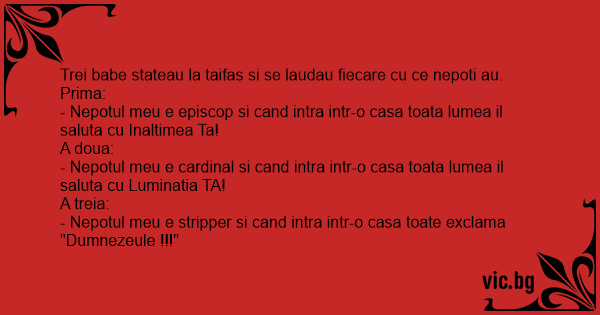 - Nepotul meu e stripper si cand intra intr-o casa toate exclama "Dumnezeule !!!"